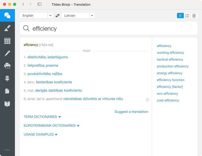 - Translate terms using Latvian, English, German, Russian, French, Lithuanian, Estonian and Ukrainian dictionaries